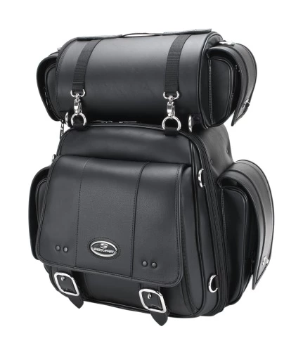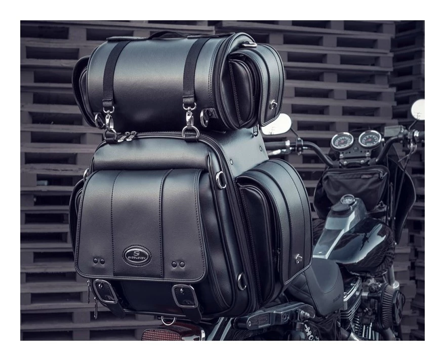 Whether it is a day ride or a weekender, Saddlemen’s sissybar bags go the distance. Built to last with over-sized hardware, riveted straps/handle and lots of space to pack it full for your journey. Main cargo component flap opens fully with solid tethered sides for easy loading. Adjustable shelf allows you to organize your bag for easy access. Works with or without a rack with the adjustable mounting sleeve that adapts to the shape and width of your bike’s sissy bar. Honeycomb rigid luggage shell maintains its shape regardless of cargo load, yet it is lightweight to reduce the impact on your motorcycle. Strong nylon meshing zipper teeth with chrome sliders equipped with large pulls for easy use with a gloved hand. Includes top roll bag for extra cargo capacity; top cargo straps mount roll bag, strap down jacket or rain gear.