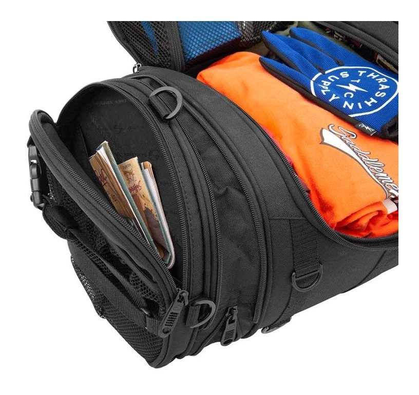 - Two mounting systems included in Saddlemen’s Versa-Mount under-seat yoke and harness or an adjustable sissy bar strap system that easily attaches bag to your motorcycle’s seat, luggage rack or sissy bar