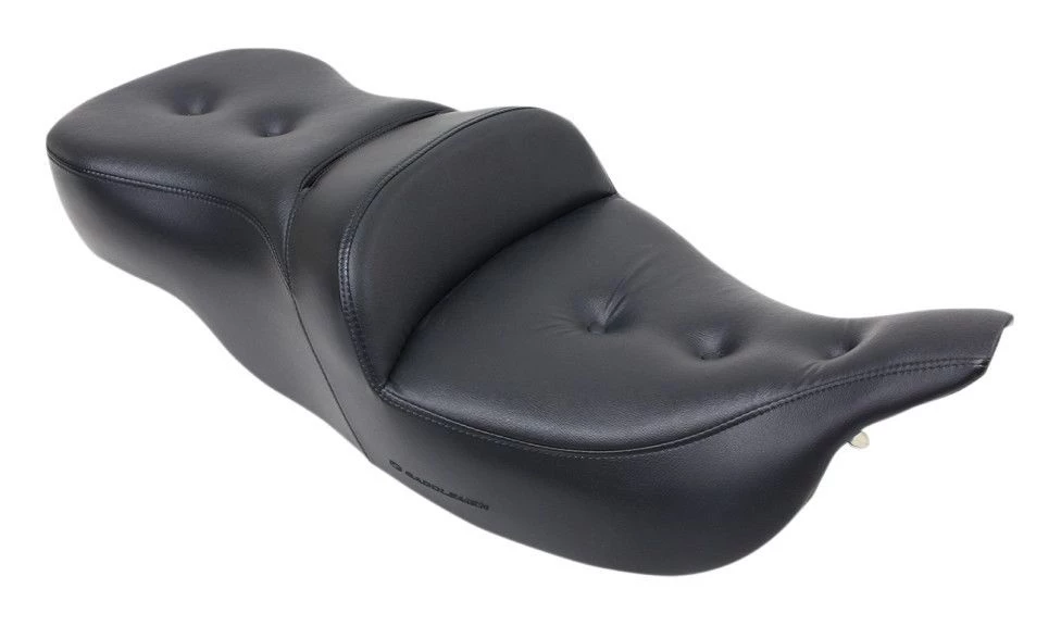 Upgrade your stock seat to a Saddlemen Road Sofa PT and trips can be as comfortable as your bike is stylish. The refined, unique split cushion design separating the lumbar support from the seating platform and the inclusion of SaddleGel mean no more hot spots or tail bone pressure – this seat offers legendary long-distance comfort. Large and comfortable rider-and-passenger saddles with smooth, wide contours have been carefully developed over years of testing, providing mile after mile of riding pleasure. When it comes to day-long comfort control, you simply cannot get a better fusion of technology, materials and design. The Road Sofa PT also features a classic, button-tufted cover and a pillow soft foam layer, providing show bike appearance and touring comfort at the same time.